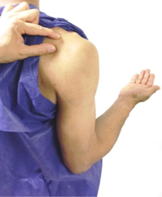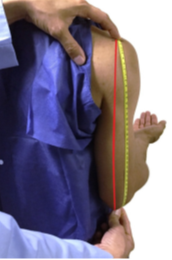 2. Mark the Measurement Site. Locate the end of the spine of the right scapula by following the scapula out to the arm until it makes a sharp V-turn to the front of the body (Exhibit 2). Using the cosmetic pencil, make a horizontal line on the uppermost edge of the posterior border of the spine extending from the acromion process (see Exhibit 3).