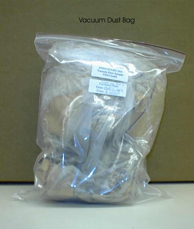 4. Place the trash bag containing the vacuum cleaner bag or the resealable plastic bag marked Vacuum Dust in the cardboard box that was used to ship your sampling kit to you. Do not refrigerate or freeze the vacuum dust sample.