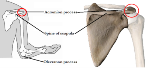 2. Mark the Measurement Site. Locate the end of the spine of the right scapula by following the scapula out to the arm until it makes a sharp V-turn to the front of the body (Exhibit 2). Using the cosmetic pencil, make a horizontal line on the uppermost edge of the posterior border of the spine extending from the acromion process (see Exhibit 3).